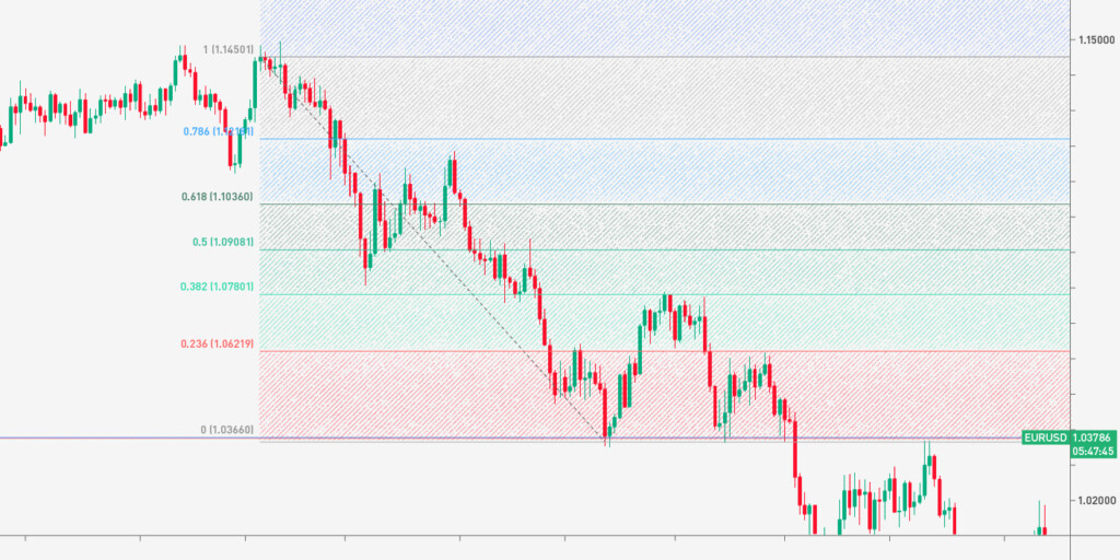 Bagan di atas menunjukkan harga rebound dari salah satu level Fibo utama—38,2% (1) dan terus bergerak dalam tren turun.