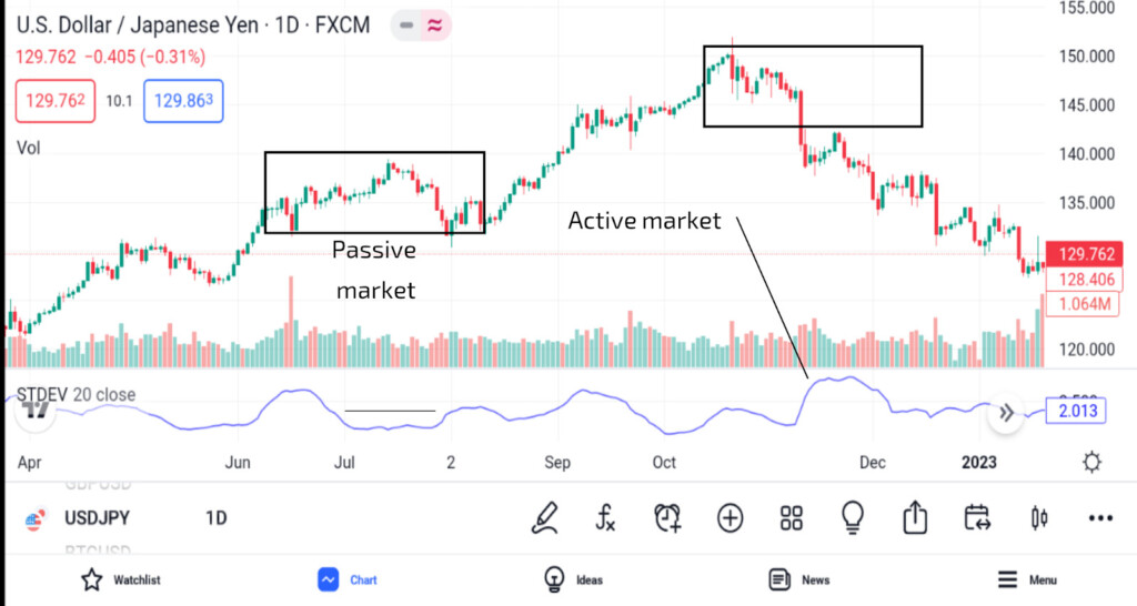 Grafik yang menunjukkan representasi pasar pasif dan aktif menggunakan indikator StdDev